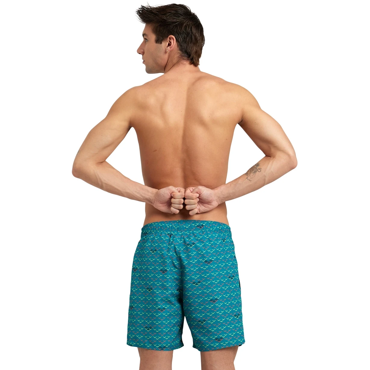 - Comfortabele en sportieve strandshorts voor mannen met een dynamische print die de natuurlijke band van de arena met het water viert.